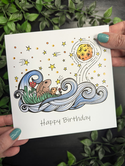 Rabbits and moon Penblwydd Hapus (Birthday Card) - Welsh Card