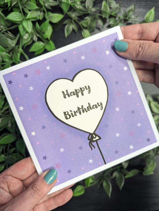 Purple Heart Balloons Penblwydd Hapus (Birthday) Card - Welsh