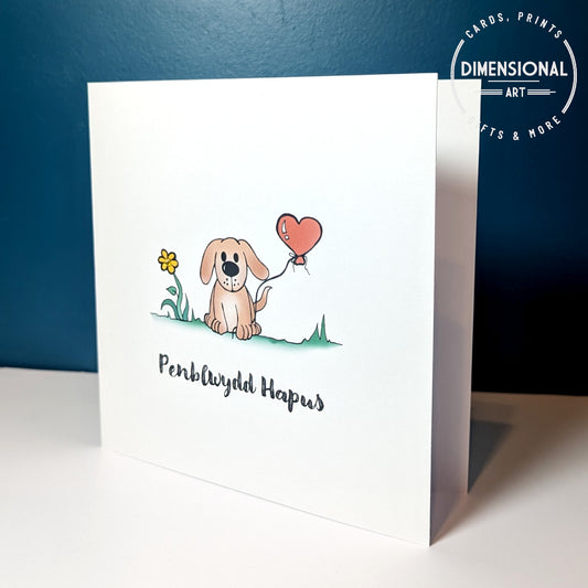 Dog heart balloon Penblwydd Hapus (Birthday Card) - Welsh Card