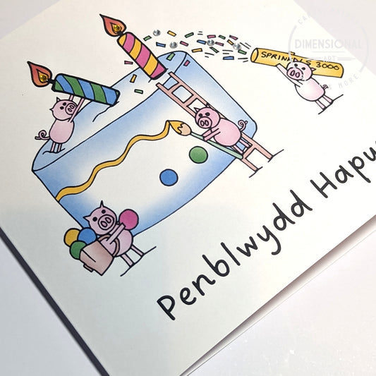 Pigs and Cake Penblwydd Hapus (Birthday) Card - Welsh
