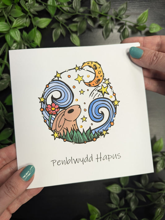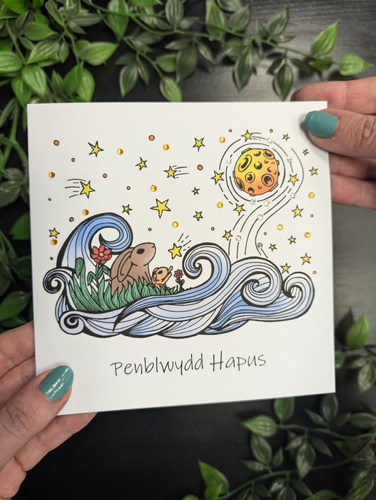 Rabbits and moon Penblwydd Hapus (Birthday Card) - Welsh Card