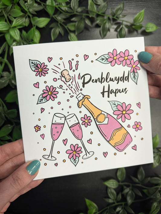 Pink Champagne and Flowers Penblwydd Hapus (Birthday Card) - Welsh Card