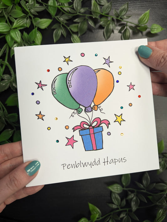 Balloons and presents Penblwydd Hapus (Birthday) Card - Welsh