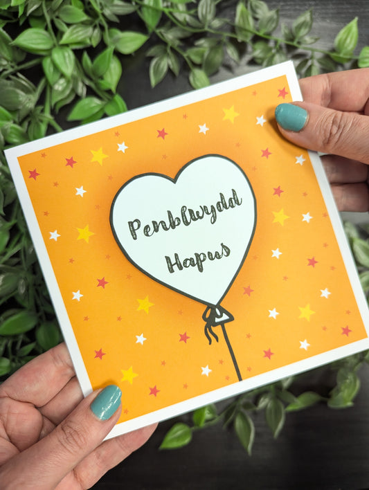 Orange Heart Balloons Penblwydd Hapus (Birthday) Card - Welsh