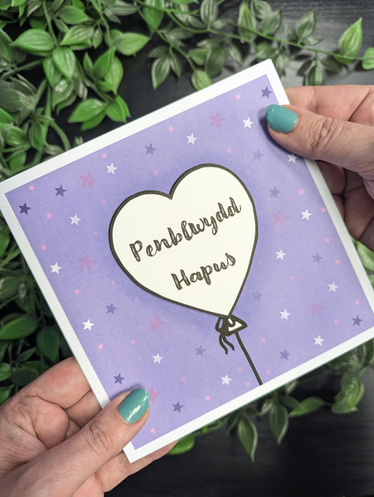 Purple Heart Balloons Penblwydd Hapus (Birthday) Card - Welsh