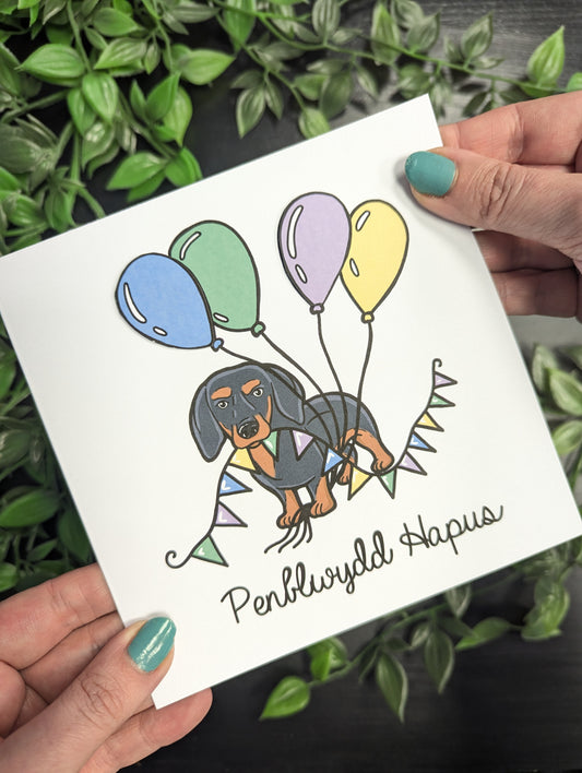 Dachshund - sausage dog - Penblwydd Hapus (Birthday Card) Welsh Card