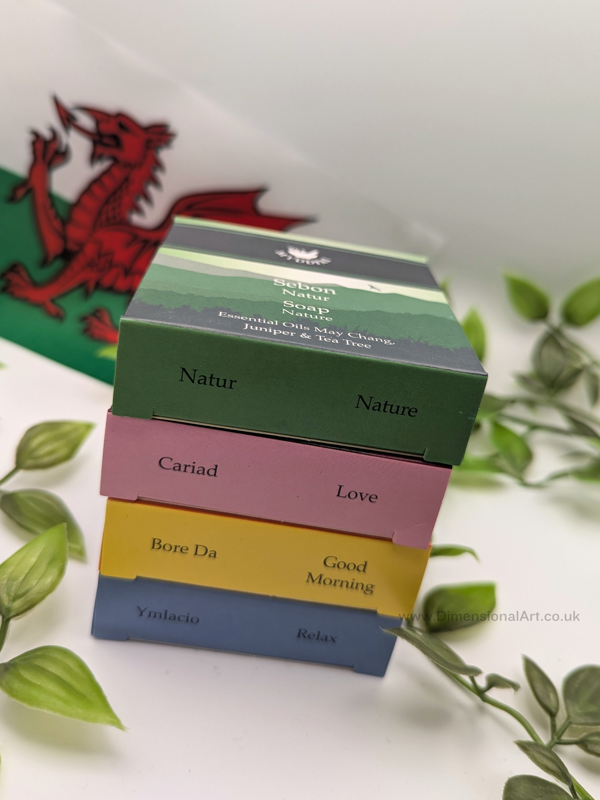 Four luxury glycerine soaps, individually boxed and tied with a Myddfai ribbon. The set contains 4 x 85g soaps: Bore Da (Good Morning), Ymlacio (Relax), Natur(Nature) & Cariad (Love)