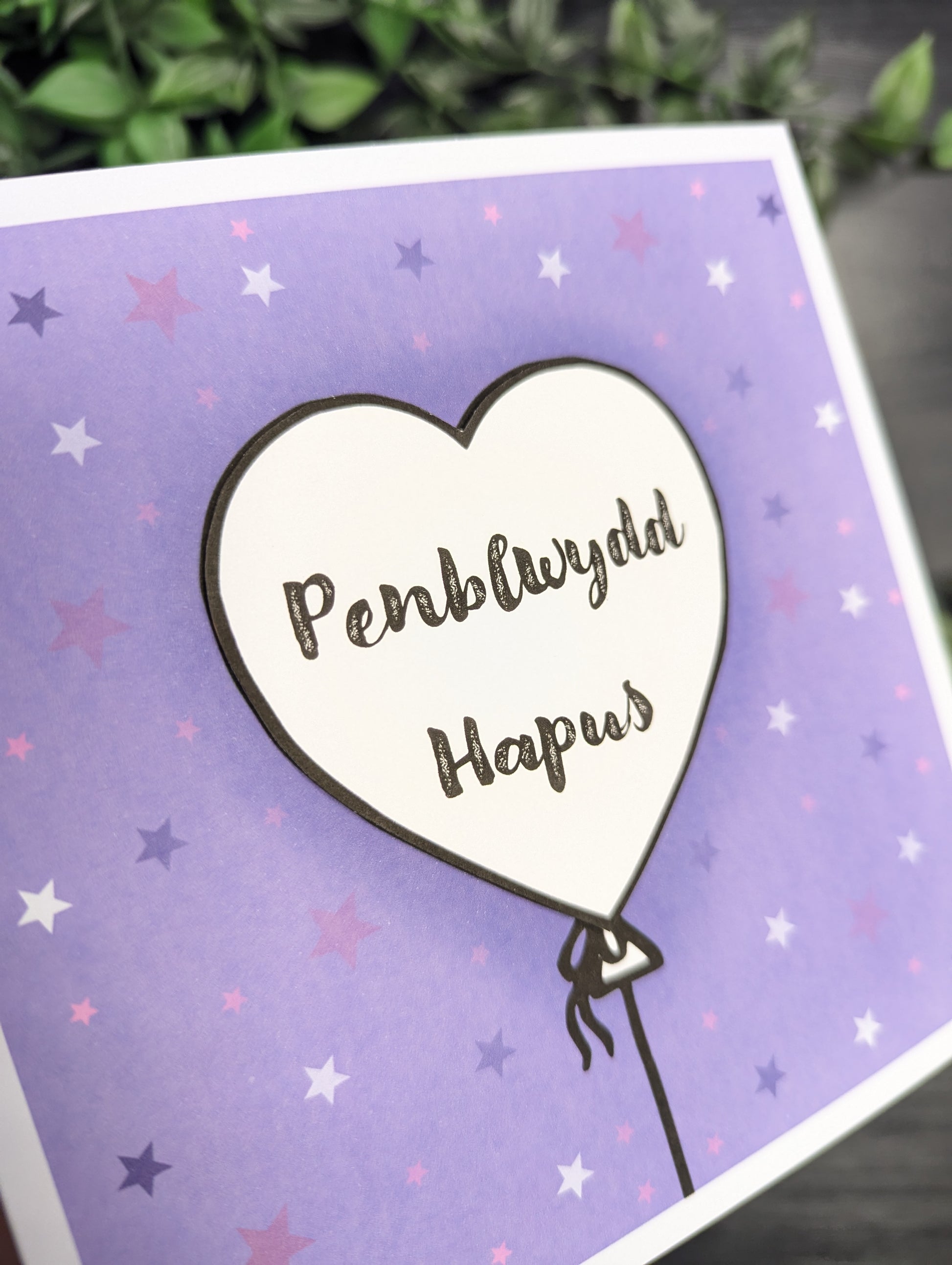 Purple Heart Balloons Penblwydd Hapus (Birthday) Card - Welsh